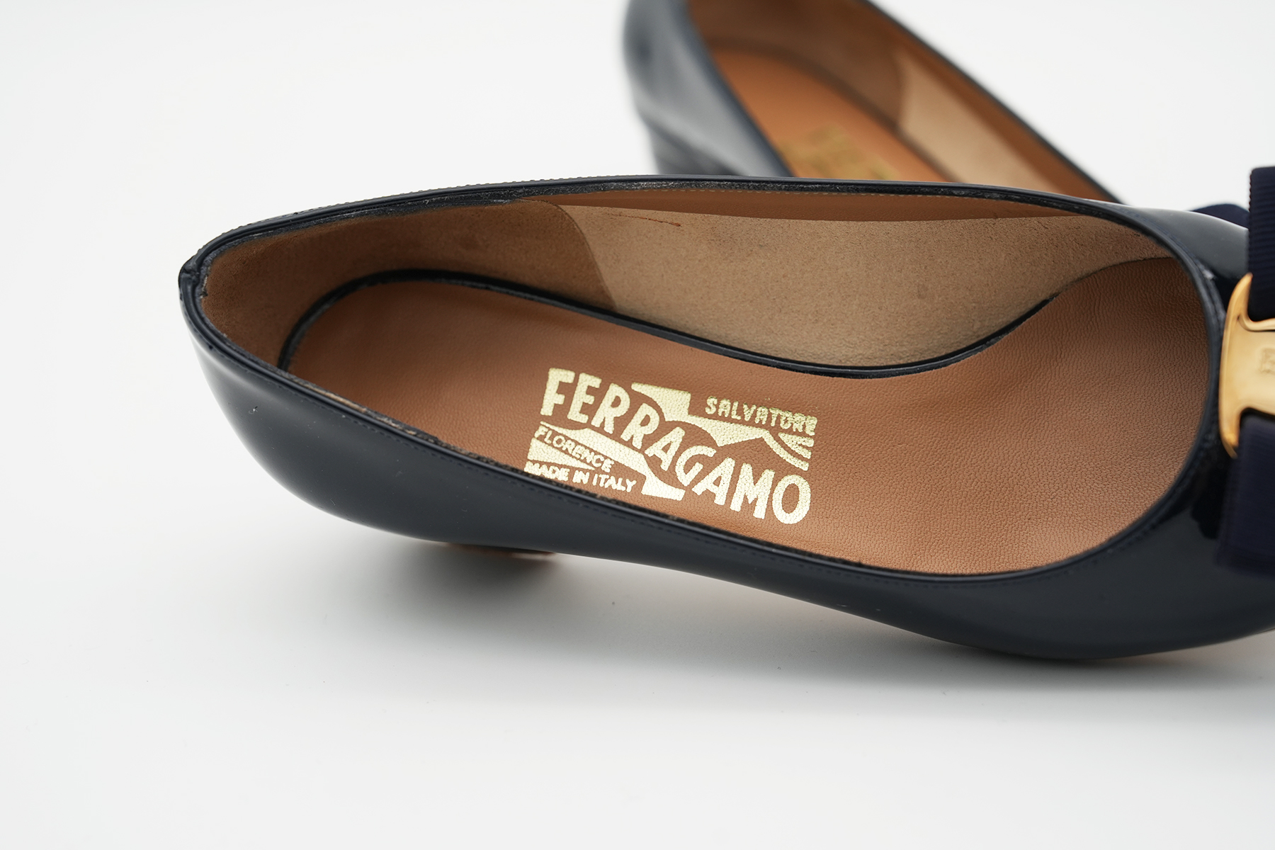 Jedes Paar ist in tiefem Dunkelblau und glänzendem Lack gehalten und mit der charakteristischen FERRAGAMO-Schleife verziert, die für Luxus und Raffinesse steht.