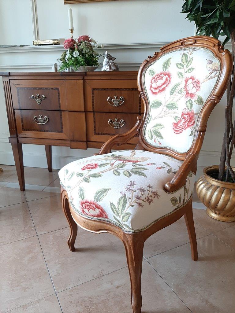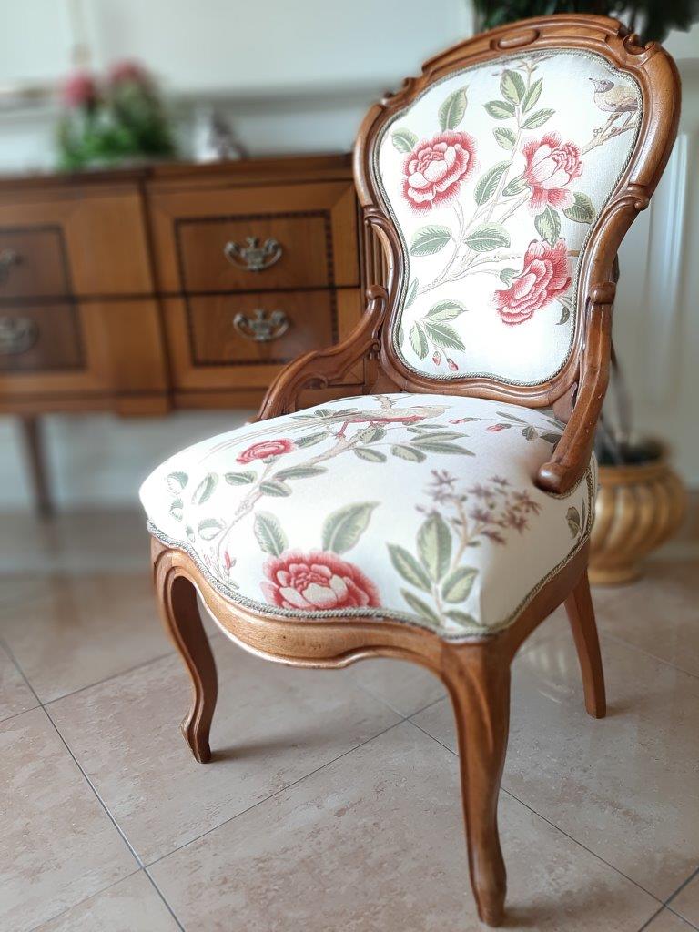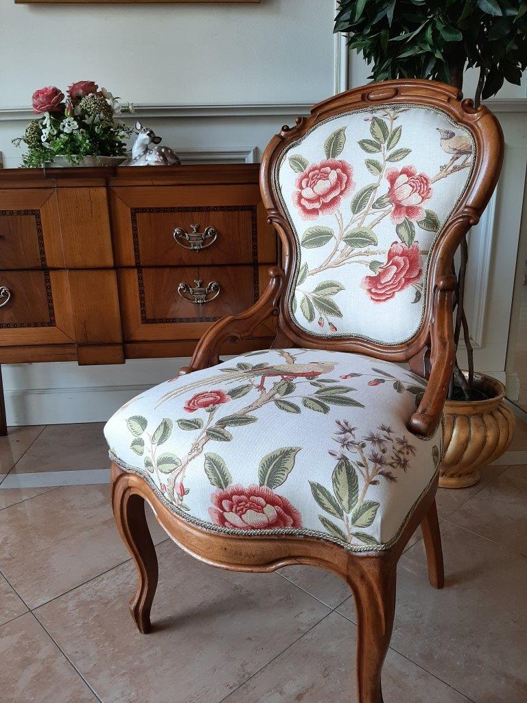 In unseren Werkstätten wurde das Sesselchen restauriert, neu gepolstert und bezogen. Nun erscheint es im neuen Glanz und bringt Wärme in Ihre Wohnräume. Sehen Sie seine schöne Form und die schlichten Schnitzereinen im Nussbaumholz.